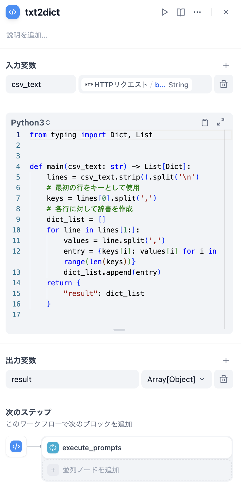 同じ形のプロンプトであるが、一部だけ変数のように扱い、複数のパターンでプロンプトを実行したいケースがある。 そのときに、変数のセットをまとめた CSV を添付して、変数だけ異なる複数のプロンプトを一度に実行できると便利である。 しかし、Dify のワークフローでは、開始時にファイルを添付することができないため、この方法が使えない。 これができると以下の利点がある。